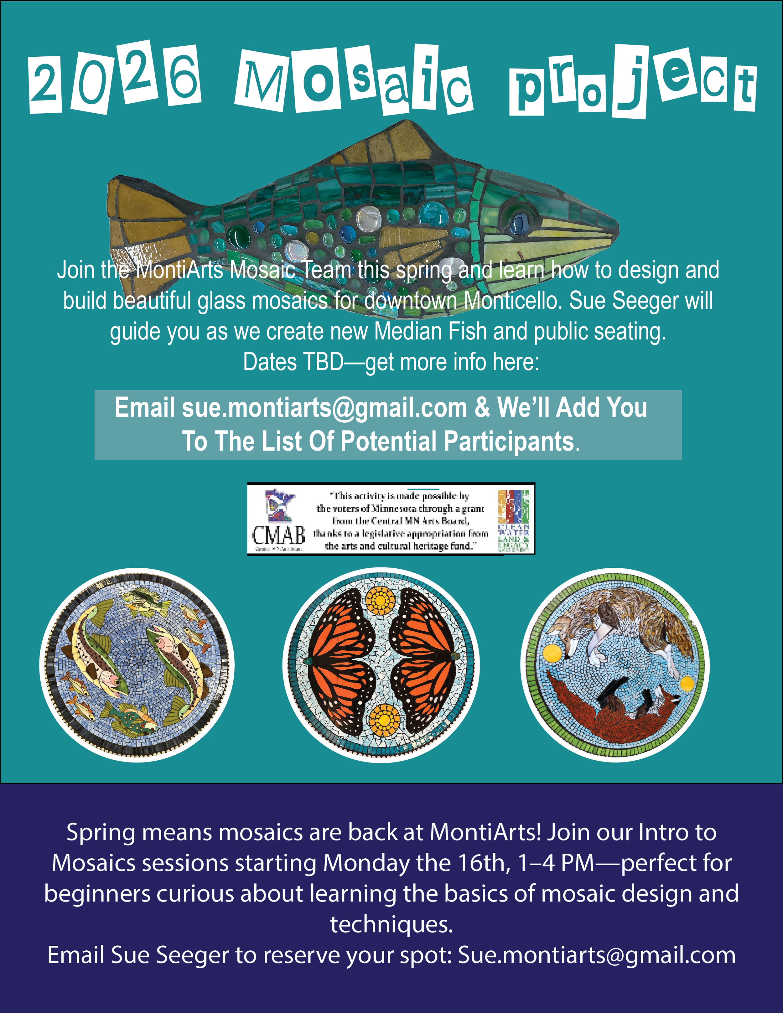 To reserve your spot or to ask any questions, please email Sue Seeger to be added to the list. We look forward to creating with you this spring. Sue.montiarts@gmail.com